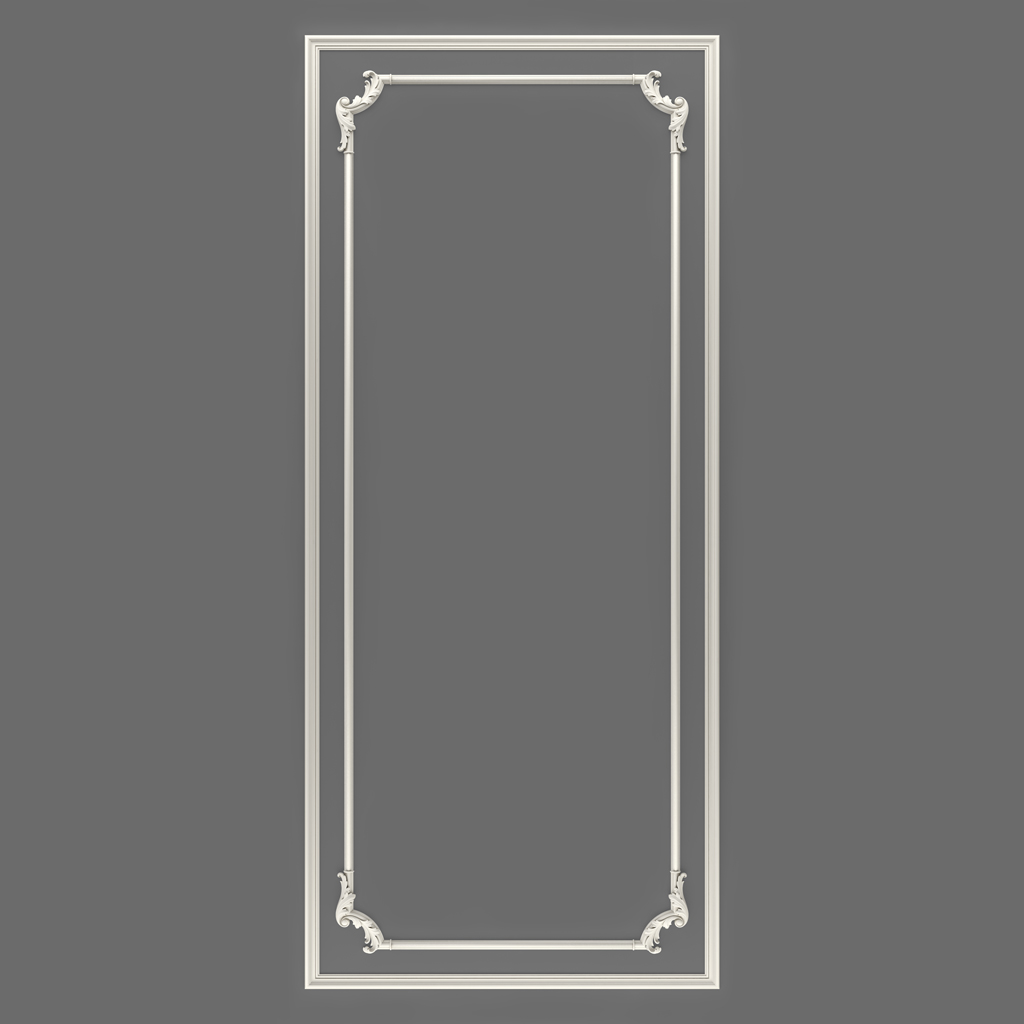 Чтобы понять ценность комплекта CPU-5-1, необходимо понять культурный и архитектурный контекст, из которого он вырастает. Буазери — от французского boiserie, деревянная обшивка — это система декоративной облицовки стен деревянными панелями с лепными или резными рамками, которая стала главным выразительным средством французского интерьера в период с середины XVII по конец XVIII века. В Версале, в особняках Марэ, в парижских отелях партикюлье именно буазери определяла характер парадных залов, приёмных, будуаров и библиотек — она создавала ощущение упорядоченности, масштаба и архитектурного достоинства, которое было недостижимо ни при каком другом способе оформления стен. Принцип системы прост и одновременно гениален: стена членится на ритмичные прямоугольные панели с помощью молдингов различного профиля, угловые переходы акцентируются декоративными накладками с орнаментом, а внутреннее пространство каждой панели остаётся либо чистым, либо наполняется живописью, зеркалами или тканевой обивкой. Именно этот принцип воспроизводит комплект CPU-5-1 в материалах XXI века — с полной точностью архитектурной логики и орнаментального языка, но без трудоёмкой ручной работы и без астрономических бюджетов, которые требовали подлинные дворцовые мастера-буазерщики. Панель размером 1000 × 2300 мм — вертикальная, почти квадратная по соотношению сторон — это классический формат буазери, рассчитанный на оформление простенков между окнами, участков стены между дверными проёмами, а также прямых стеновых секций в гостиных, столовых, спальнях и кабинетах.