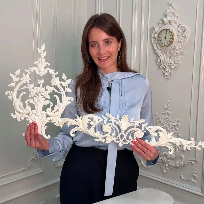 Пара декоративных угловых накладок MLDPU-2U-2.1R и MLDPU-2U-2.1L размером 200 × 135 × 20 мм — это главный орнаментальный элемент комплекта CPU-5-1, придающий геометрической рамочной системе живой барочный характер. Буква R обозначает правую версию накладки, буква L — левую: они являются зеркальными отражениями друг друга и устанавливаются в парных угловых позициях рамки — правый верхний и левый нижний угол либо левый верхний и правый нижний, в зависимости от выбранной схемы расстановки. Размер 200 × 135 мм обеспечивает достаточную площадь орнаментального поля, чтобы накладка воспринималась как полноценный скульптурный акцент, а не как незначительная деталь. Глубина рельефа 20 мм — максимальная в составе комплекта — создаёт наиболее объёмный, наиболее скульптурный элемент системы, что архитектурно правильно: угловые узлы в классической буазери всегда несут наибольшую орнаментальную нагрузку, именно в них сосредоточена декоративная энергия всей системы. Орнамент накладок выполнен в традиции французского рококо: характерные завитки-волюты с акантовыми листьями, плавные S-образные изгибы, мягкая пластика перьев и листьев — всё это создаёт характерный для рококо образ живой природы, схваченной в динамике и подчинённой орнаментальному ритму. Накладки изготовлены из полиуретана высокой плотности, что обеспечивает исключительную чёткость рельефа, биологическую инертность, влагостойкость и долговечность. Поверхность загрунтована и готова к финишной окраске — орнаментальные детали глубиной 20 мм хорошо принимают любые техники нанесения краски, включая патинирование и двойное тонирование.