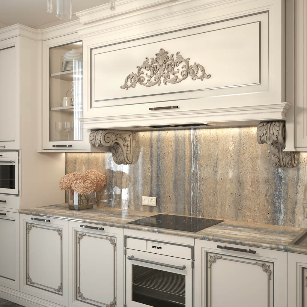 Кухня в классическом белом стиле. Фасады МДФ с фрезерованными рамочными пазами, молдинг по контуру фасада, белая эмаль по всей поверхности. В углы каждого фасада устанавливается MLD-1U-1.1 из бука под белую эмаль. После покраски декор сливается с фасадом в единый объект — и кухня приобретает вид, который ассоциируется с кухонными гарнитурами категории «люкс».