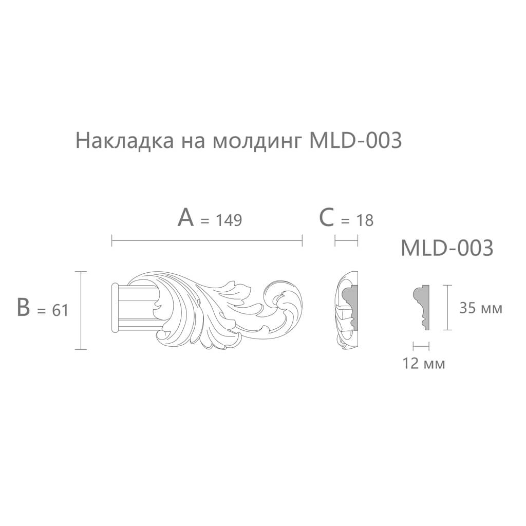 Молдинг MLD-003 имеет профиль 35 × 12 мм. Ширина наконечника — 61 мм, то есть примерно в 1,7 раза шире профиля. Это рабочая пропорция: наконечник чуть шире молдинга, за счёт чего орнамент читается как раскрытие, а не как продолжение или просто накладка.
