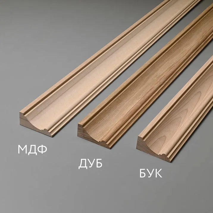 Карниз из бука с однородной структурой (680–770 кг/м³) хорошо обрабатывается, ровно окрашивается, стабилен по размерам (0.7–0.9%). Мелкопористая поверхность (50–100 мкм) идеально принимает водные и спиртовые морилки; эмаль даёт гладкое долговечное покрытие.