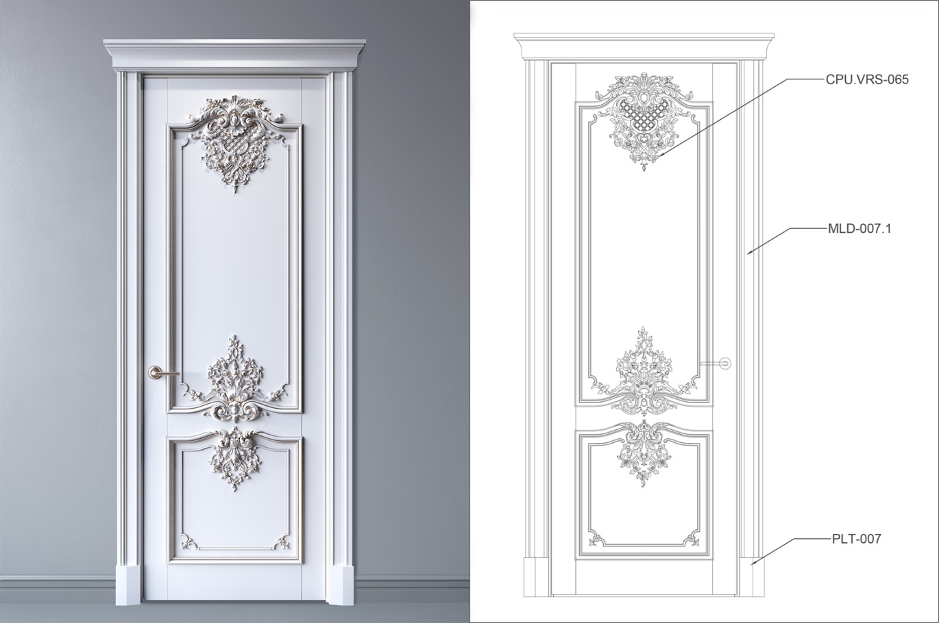 Молдинги – это неотъемлемая часть классического декора, которая придает двери структурность и выразительность. MLD-007.1 используется для создания рамок вокруг центральной панели, добавляя двери глубину и объем. Эта деталь помогает разделить композицию на несколько частей, подчеркивая основные акценты. MLD-036, расположенный в нижней части двери, придает ей баланс и симметрию, что особенно важно для создания гармоничного облика.
