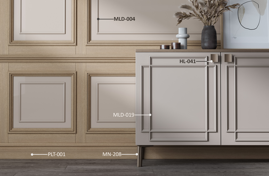 Молдинги MLD-004 и MLD-019 играют ключевую роль в создании визуального объема и утончённости комода KMD-012. Эти декоративные элементы подчёркивают линии и формы мебели, добавляя ей выразительности и глубины. Молдинги выполняют не только эстетическую функцию, но и помогают соединить элементы комода в единое гармоничное целое.
