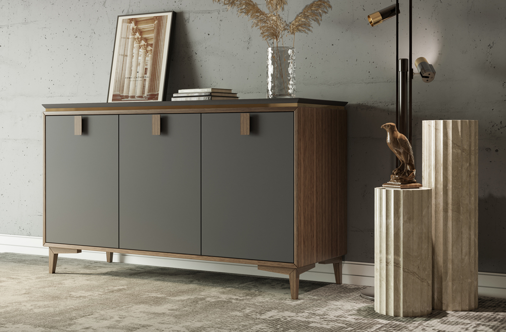 Комод KMD-018 — это воплощение современного дизайна, сочетающего в себе элегантность, минимализм и функциональность. Его лаконичные линии и продуманный декор делают его идеальным дополнением для интерьера в современном стиле. Ключевые элементы декора, такие как мебельная ручка Plato HL-015 и геометрические ножки MN-209, подчеркивают утонченность и изысканность этого изделия. Особое внимание в этом интерьере заслуживает также использование навершия L-105 в качестве самостоятельного элемента декора, что придаёт пространству уникальный и завершённый вид.