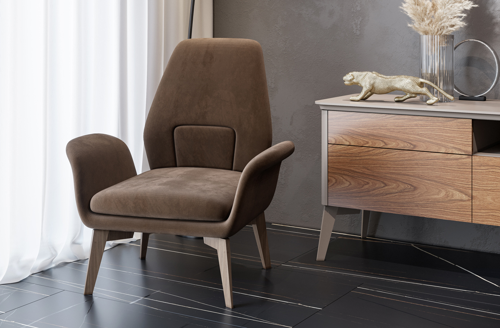 Особое внимание заслуживает то, как ножки MN-215 используются не только в комоде KMD-020, но и в кресле, представленном рядом с ним. Это создаёт единый и гармоничный образ, который прекрасно вписывается в современные интерьеры. Комбинация комода и кресла с одинаковыми ножками подчёркивает общий стиль комнаты и делает её более сбалансированной и цельной.