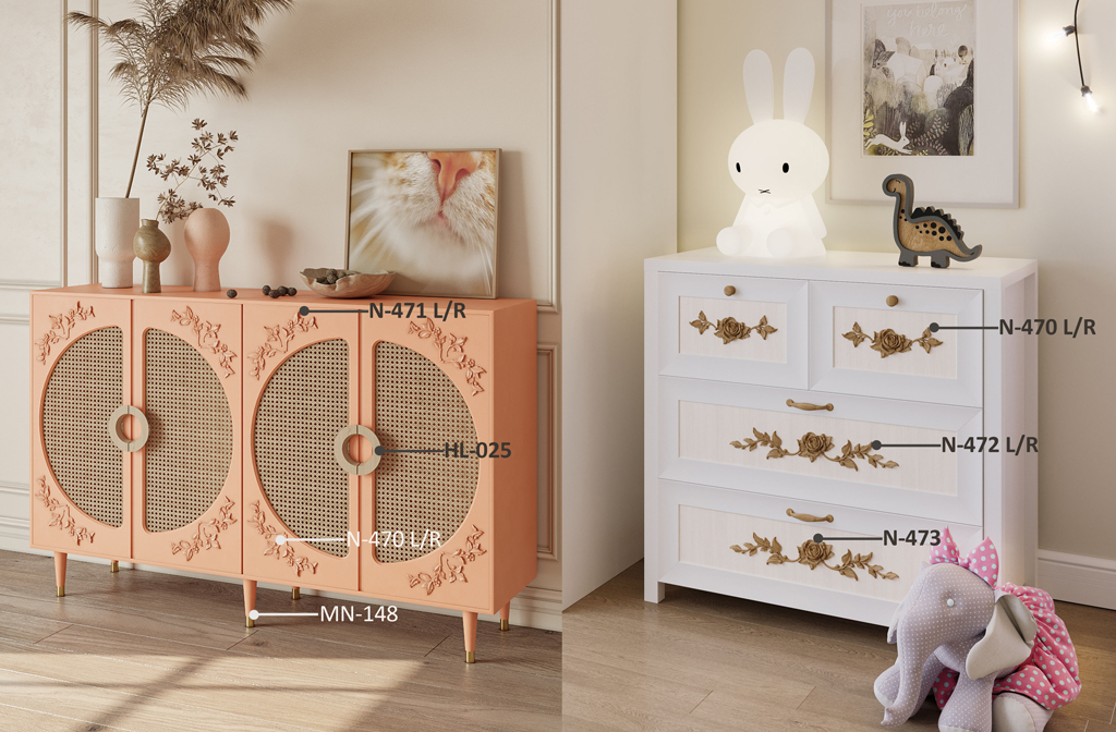 - Резная накладка N-470R и резная накладка N-470L: Эти элементы украшают боковые части комода, придавая им завершенный вид и делая дизайн более объемным и богатым.