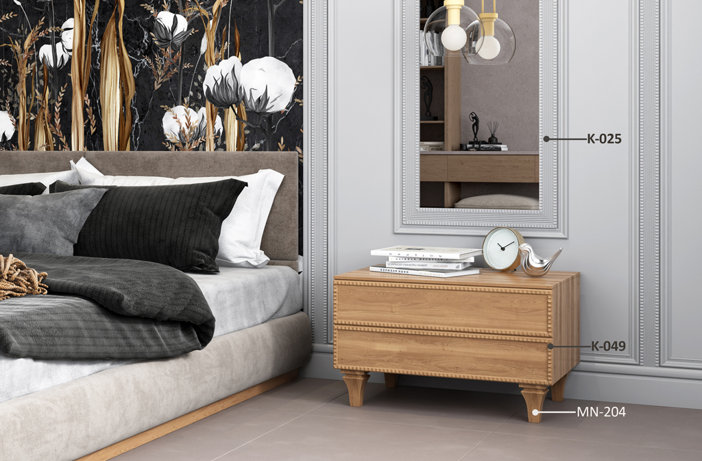В спальне тумба KMD-010 может служить прикроватной тумбой, создавая атмосферу комфорта и уюта. Её классический дизайн позволяет легко сочетать её с другими элементами интерьера, такими как кровати с мягким изголовьем или классические светильники. Используйте её для хранения книг, ночных кремов или декоративных аксессуаров.