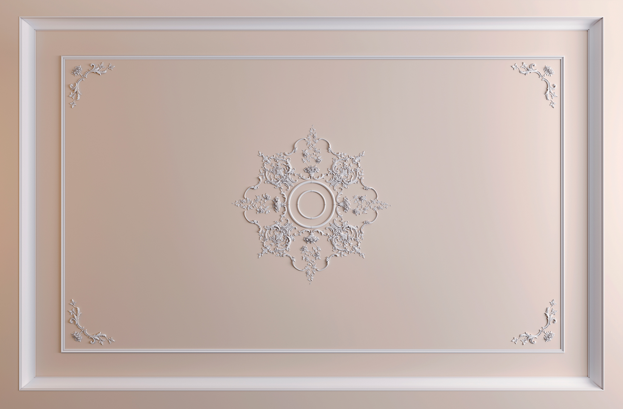 Классическое белое исполнение предполагает окрашивание всех элементов композиции в один тон, создающий эффект традиционной гипсовой лепнины. Монохромное решение подчёркивает рельеф орнамента за счёт игры света и тени, создавая изысканный и элегантный декор без цветовых акцентов. Белая композиция на светлом потолке формирует тонкую объёмную структуру, добавляющую пространству глубину и архитектурную выразительность.