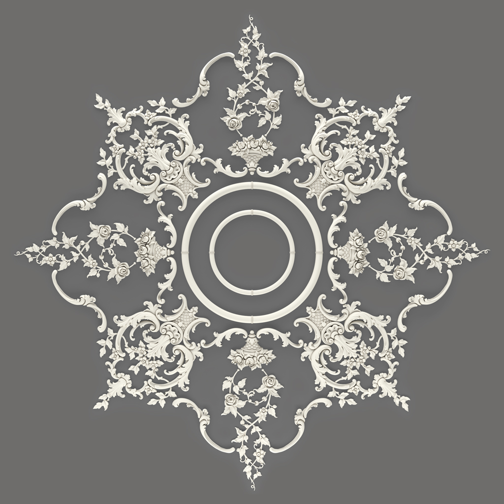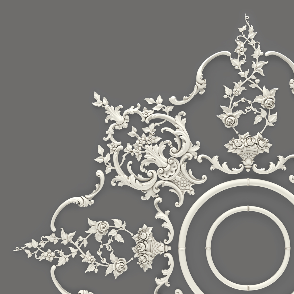 Декоративные медальоны MLDPU-027U различных размеров размещаются в узловых точках композиции — на пересечениях осевых линий, в центрах образовавшихся декоративных секторов, в промежутках между крупными элементами. Крупные медальоны создают вторичные фокусные точки, тогда как мелкие служат связующими элементами, обеспечивающими визуальное единство всей композиции.